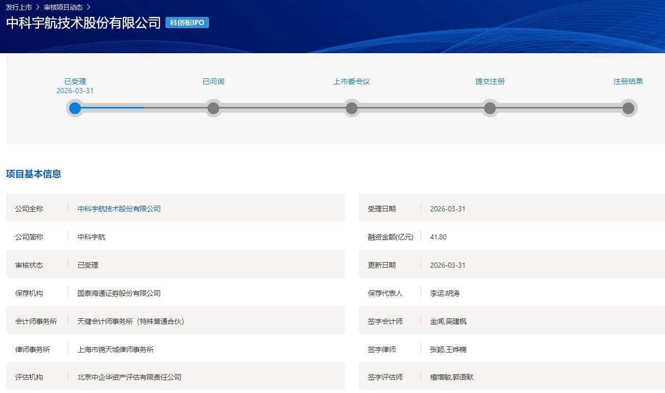 【大河财立方消息】3月31日,中科宇航技术股份有限公司(以下简称中科宇航)递交科创板上市招股书,获上交所受理。